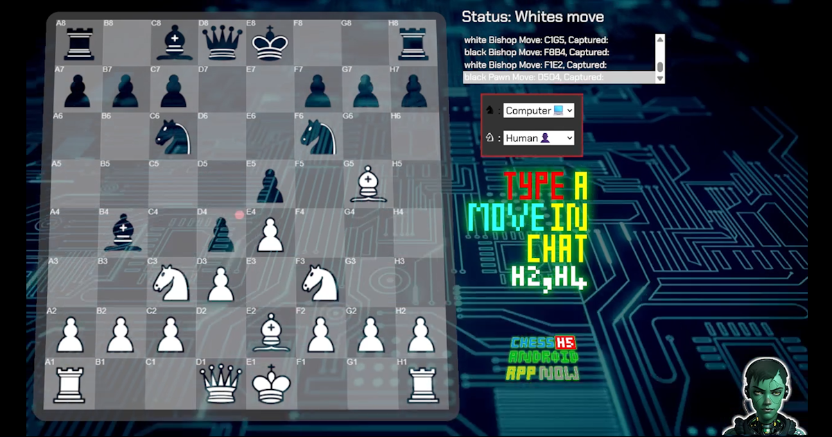 To play chess against the computer offline, change one of the 'Player:' drop-down box, for Black or White, to 'Computer' and the computer will begin to play and make its move during its turn. Note for local vs. Computer games you don't have to have the chess board in the start position. You can position the board as you want while both 'Player:' drop-down boxes are set to 'Human and then change one of them to 'Computer' and thus the AI will continue playing from that position. You can also change both Black's and White's 'Player:' drop-down boxes to 'Computer' to get the AI to play against itself.